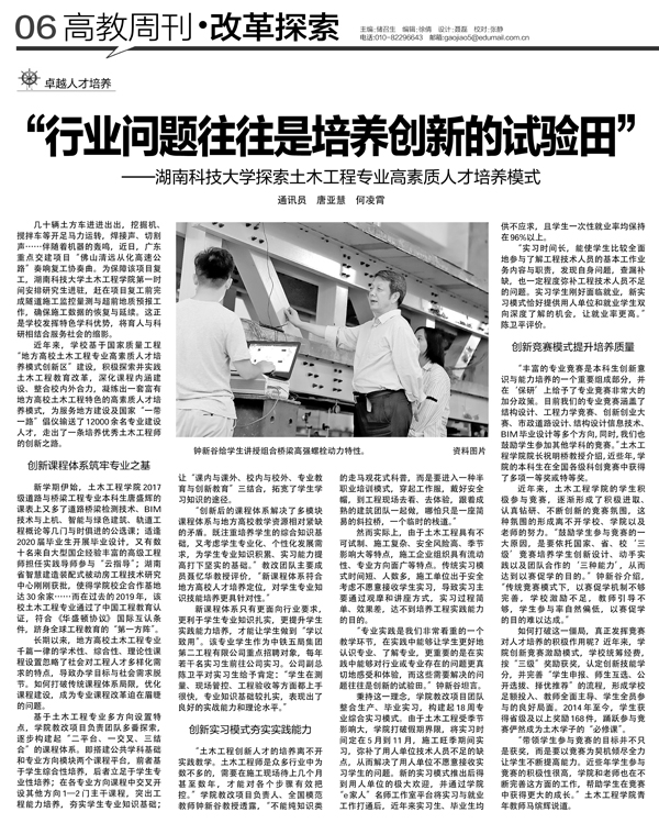 近年来,学校基于国家质量工程“地方高校土木工程专业高素质人才培养模式创新区”建设,积极探索并实践土木工程教育改革,深化课程内涵建设、整合校内外合力,凝练出一套富有地方高校土木工程特色的高素质人才培养模式,为服务地方建设及国家“一带一路”倡仪输送了12000余名专业建设人才,走出了一条培养优秀土木工程师的创新之路。